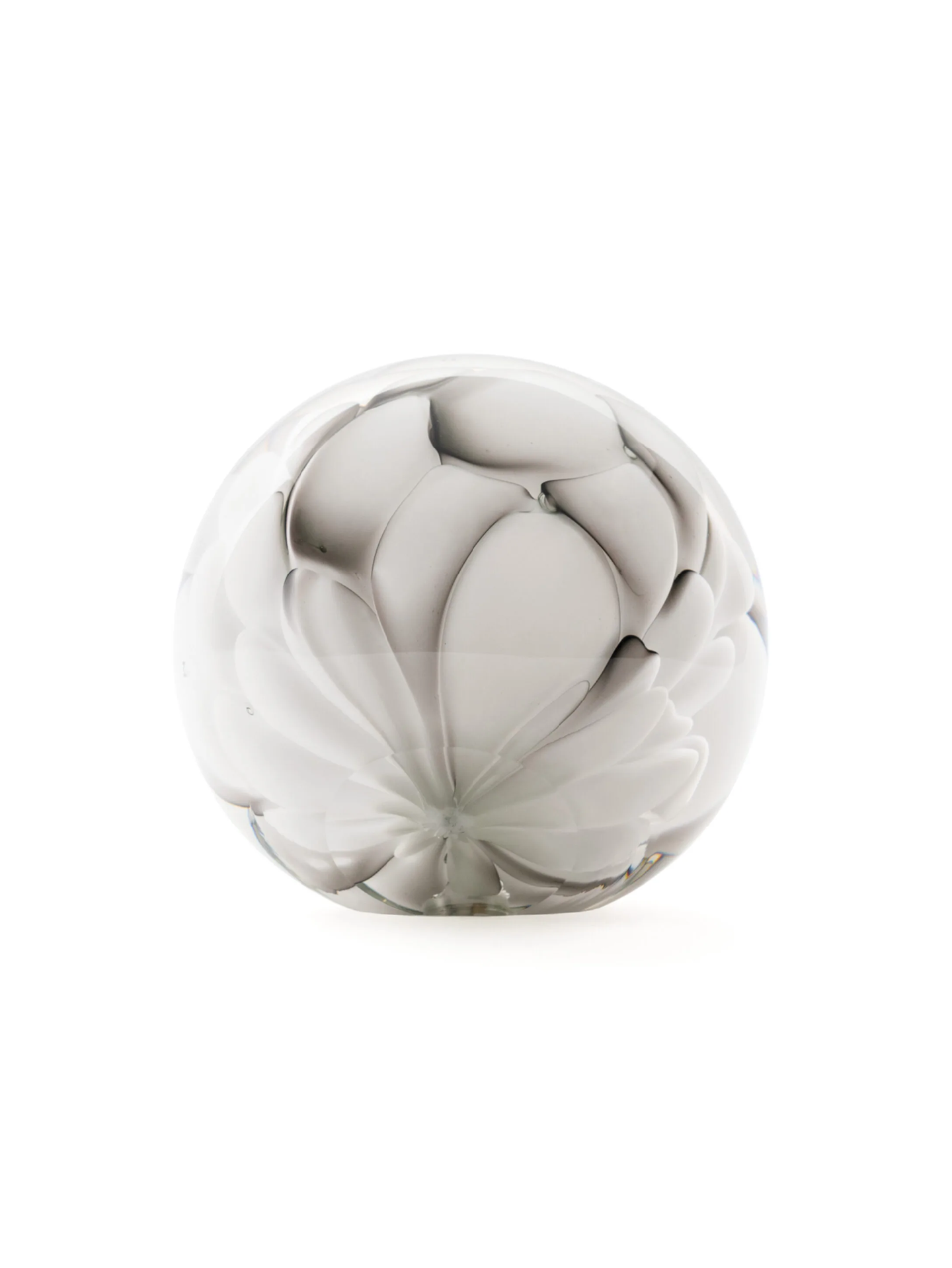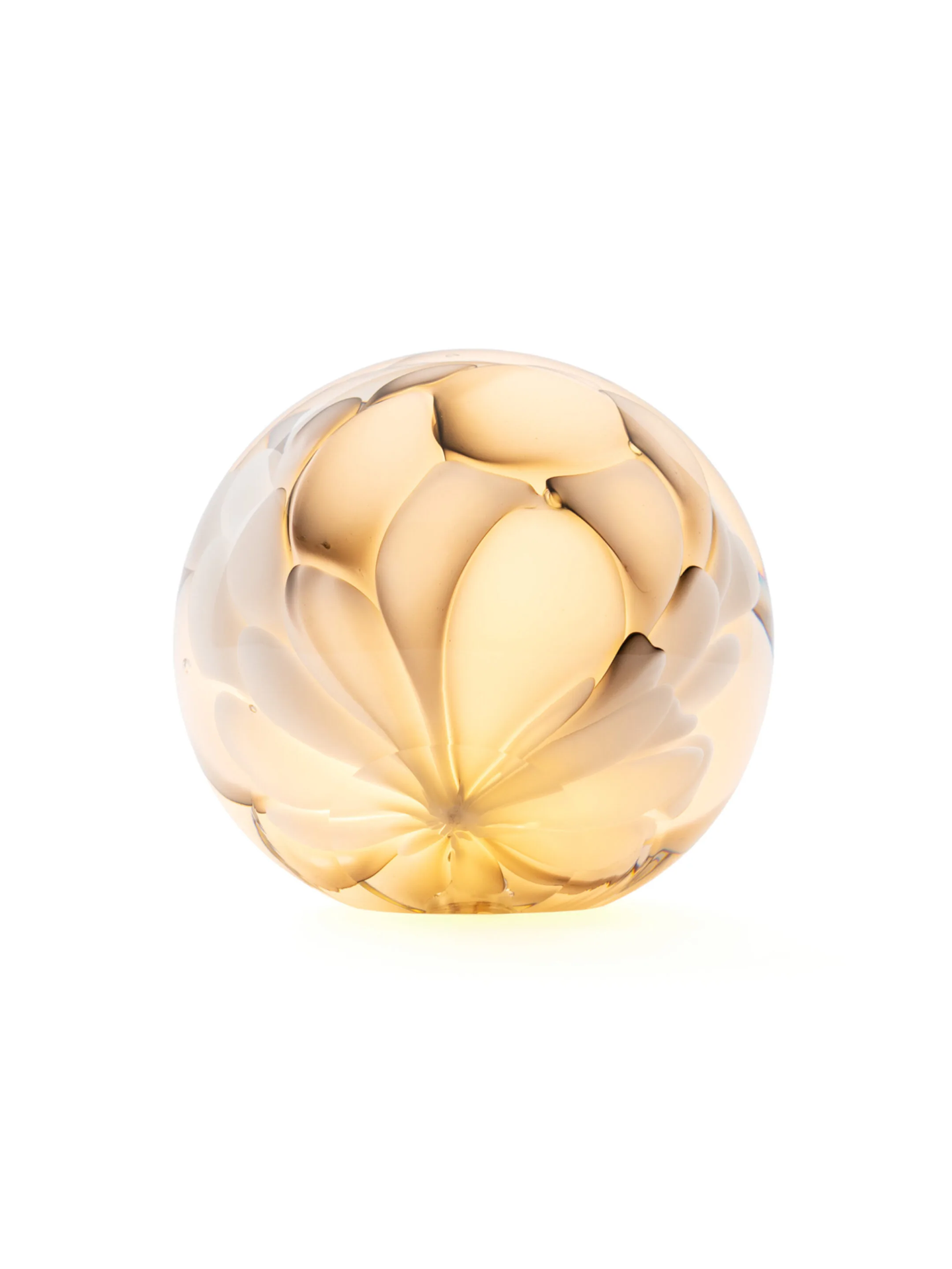 Cada pieza se forma dentro de un molde reutilizable. A medida que se introduce aire, el vidrio se expande para llenar los espacios abiertos dentro de la estructura. El calor lo mantiene maleable mientras la gravedad lo atrae hacia abajo, creando formas alargadas que siguen los contornos del molde, generando suaves estiramientos y marcas. Una vez que la pieza se enfría y se fija, la estructura de acero se retira, se limpia y se utiliza nuevamente. La esfera terminada conserva las sutiles huellas del proceso de conformado.