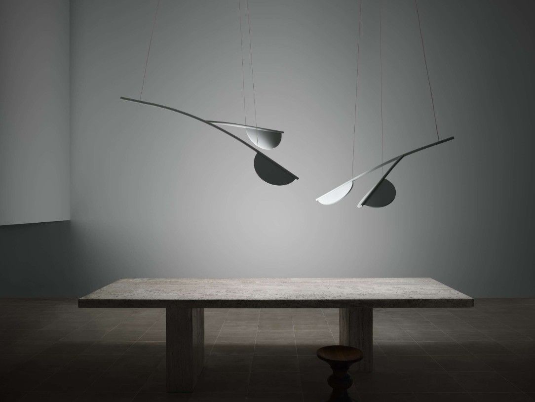 Lámpara de suspensión con emisión de luz difusa, disponible en composiciones lineales y orgánicas. Estructura tubular de aluminio y terminales de aluminio CNC con acabado metalizado o mate. Tecnología Edge Lighting integrada. Las luminarias se pueden girar en intervalos de 60° dentro de la estructura para cambiar la dirección de la luz emitida. Roseta metálica con acabado mate blanco o sólo imprimación. La versión con acabado de imprimación se puede pintar después de su instalación con acabados al agua convencionales (témpera, estuco, pintura al agua) para garantizar una integración impecable en el edificio. El sistema electrónico integrado en la roseta del techo permite el uso de distintos sistemas de regulación: 1-10 V, DALI, push o potenciómetro. El cable tiene una longitud muy práctica de 3 metros. El producto se ha diseñado conforme a la norma ISCC y en su montaje no se pega ningn componente, para que puedan separarse completamente para su futuro reciclaje.