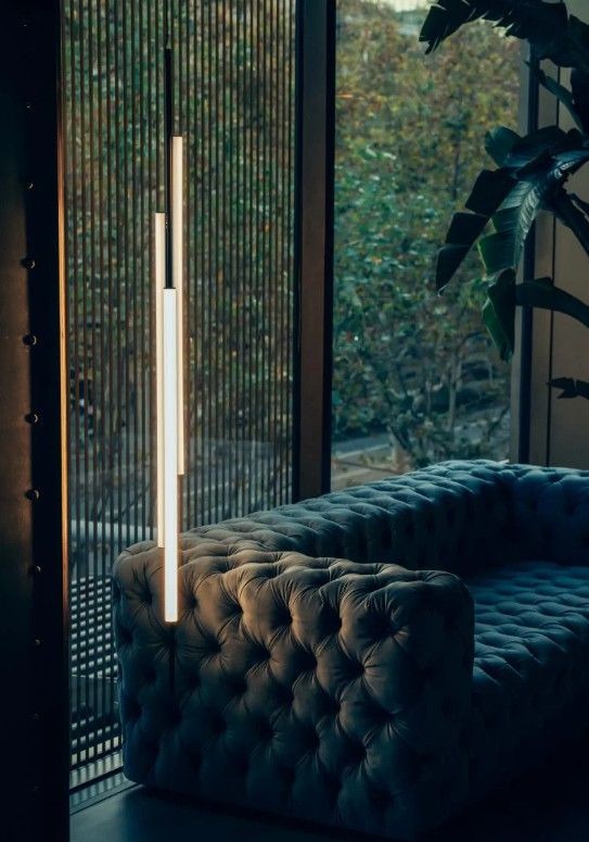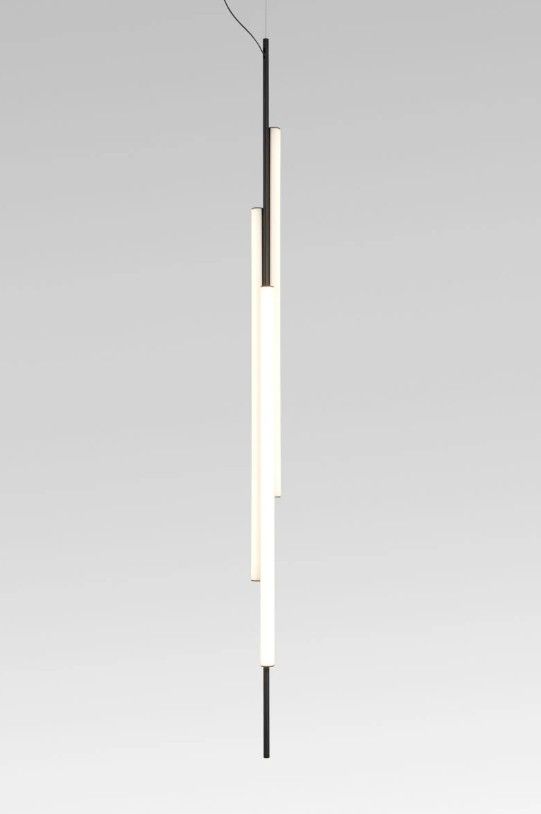 Ambrosia es, en esencia, una línea de luz que puede convertirse en un sistema modular, capaz de extender su iluminación y adaptarse a cualquier espacio. Un diseño que recupera y revisa la luz de la linestra, atemporal, la actualiza y consigue que su estructura sencilla y su iluminación difusa aporten belleza al lugar. Esta colección amplía sus posibilidades proponiendo un cambio del plano de luz, pasando de iluminar en horizontal a hacerlo en vertical. Esta nueva tipología de lámpara se presenta en dos versiones, ambas de suspensión. Por una parte, la Ambrosia V con una estructura vertical de 235 cm de alto formada por dos tubos de luz, de longitudes distintas. Una línea de luz interrumpida, un detalle que aporta ligereza y dinamismo a la lámpara. Su diseño permite escoger la iluminación, orientándola hacia la pared se genera luz indirecta, o hacia el espacio para proyectar luz directa. Un diseño estético y resolutivo también para entornos domésticos.