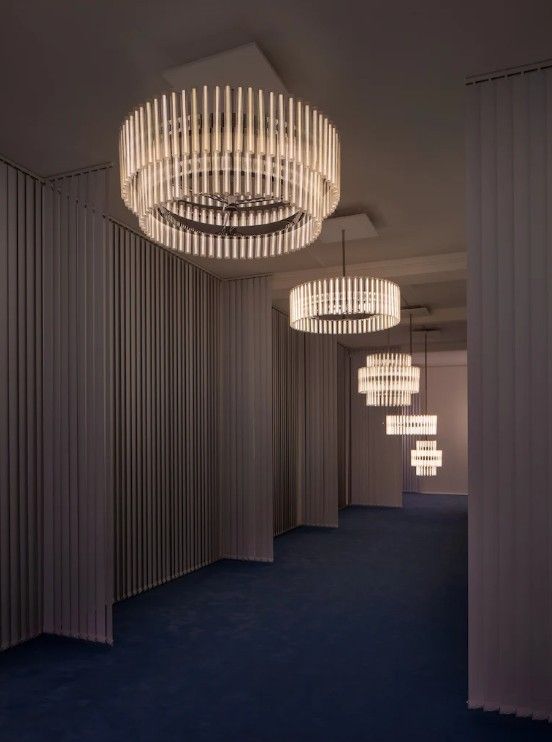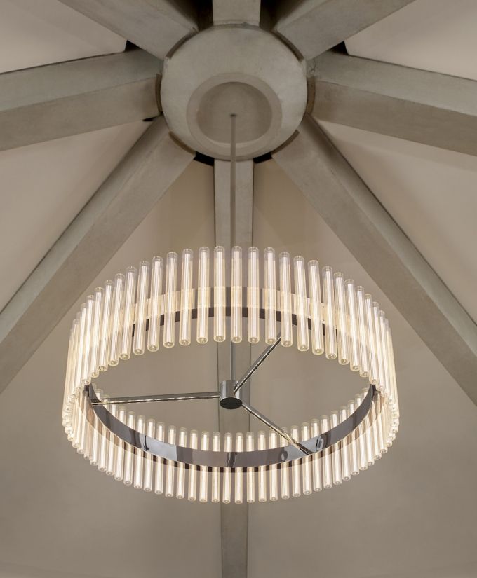 Un candelabro de múltiples configuraciones que proyecta capas de etéreos anillos de luz creados a partir de bombillas LED lineales. Creado y producido por Lee Broom, los bulbos de vidrio soplado a mano contienen un filamento LED perpendicular que se refracta contra las líneas verticales del vidrio estriado. Dispuestos en conjunto y reflejándose en los anillos, el efecto general genera un aura luminosa envolvente.