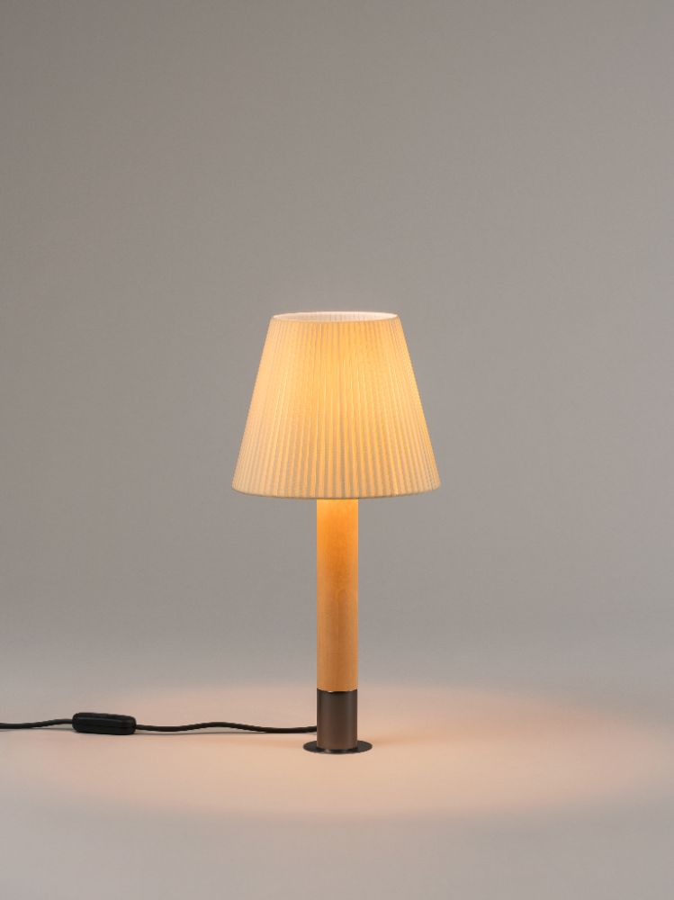 En un momento en que el gusto internacional se sentía fascinado por las lámparas de tubo metálico con bombillas halógenas, fuentes de luz fría, nosotros quisimos defender la calidez mediante la lámpara Básica. Ello significó el retorno a los materiales naturales como la madera, la cartulina cosida o las cintas. La estética defendida desafiaba al gusto dominante del momento porque respaldaba una modernidad más artesana y próxima, y terminó dando alas a la expansión internacional de Santa & Cole, impulsando en Europa una corriente alternativa. La Básica sigue apoyando tales premisas treinta y cinco años después. Un cilindro de madera, sostenido por una pesada base metálica de igual diámetro, acabada en bronce o níquel, que asienta una variedad de pantallas de varias formas y colores, ocho en total. Y aunque el equilibrio es de por sí muy bueno, puede mejorarse con una opcional base inferior, más ancha, para su uso en colectividades
