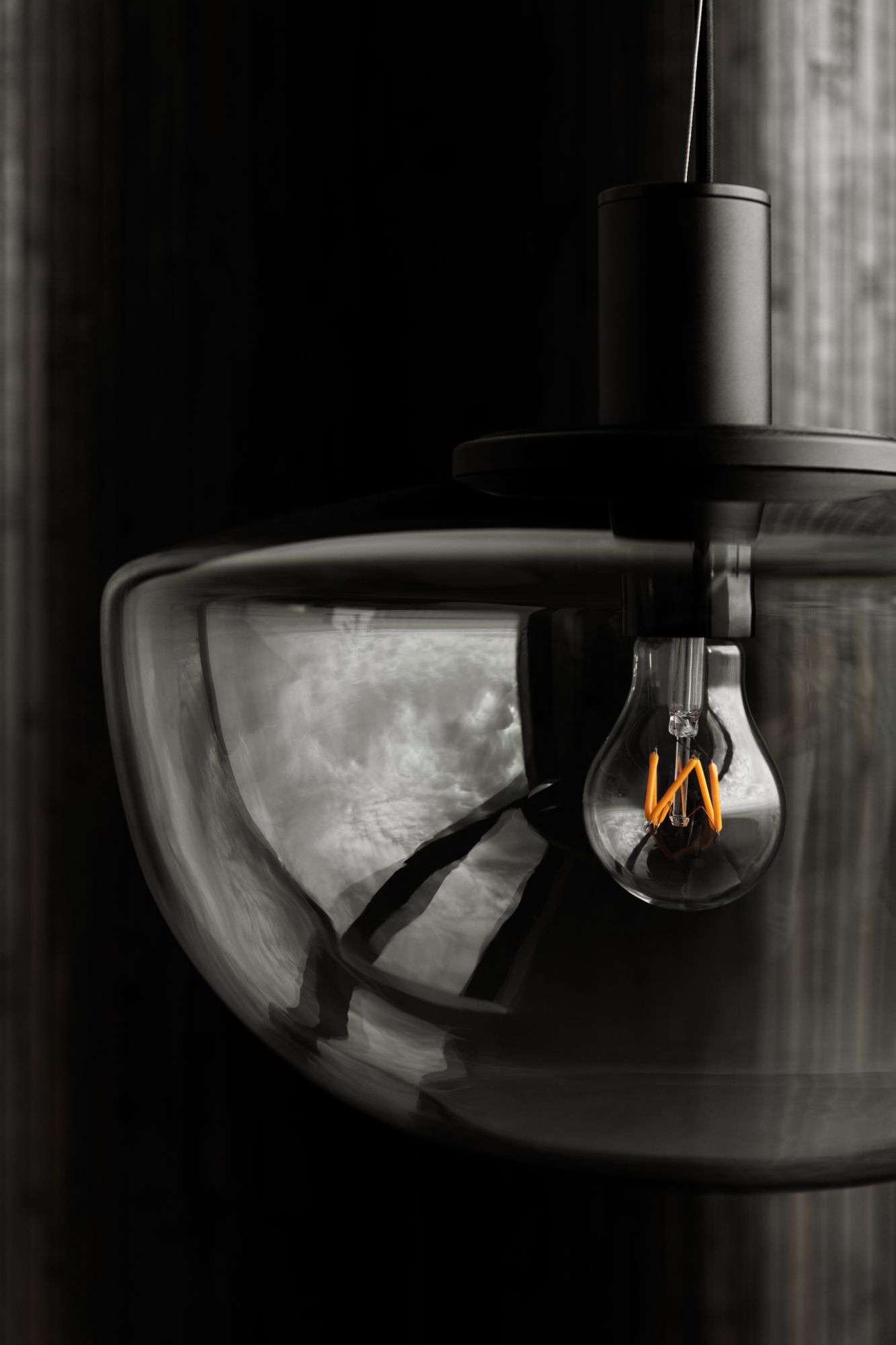Bank Pendant is a semicircular indoor pendant made of mouth-blown opal or smoke glass and black powder-coated aluminum fittings. The opaque glass gently diffuses the 360-degree light from any E26 bulb, creating ambiance and providing excellent task lighting. The combination of opaque glass and fine metal gives the product lasting quality, tactility, and longevity. A special cable attachment ensures the glass shade can be easily adjusted for even hanging.
