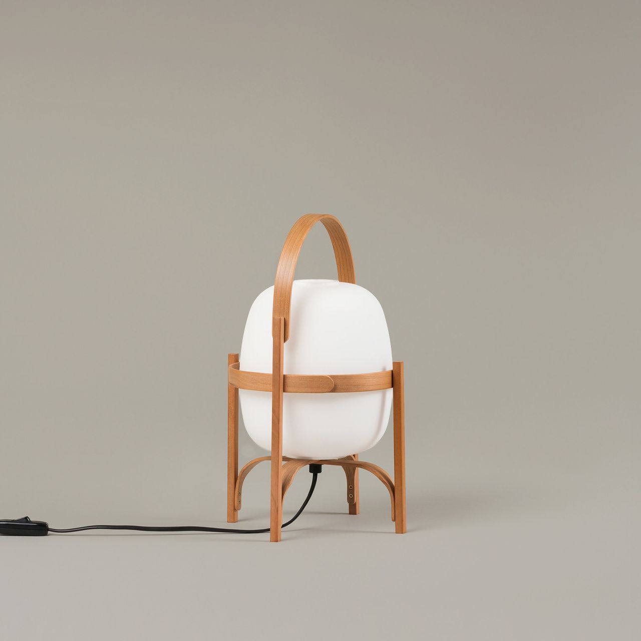 La versión pequeña de la lámpara Cesta se define por una menor sección en su estructura de madera, siempre pulida con esmero y ensamblada con firmeza, que alberga un pequeño globo de vidrio opal donde se cobija su luz. Este diseño, que constituye un objeto-lámpara que crea espacios de placer allí donde se ubica, ha constituido uno de los más divulgados iconos internacionales de su autor.