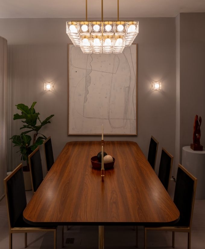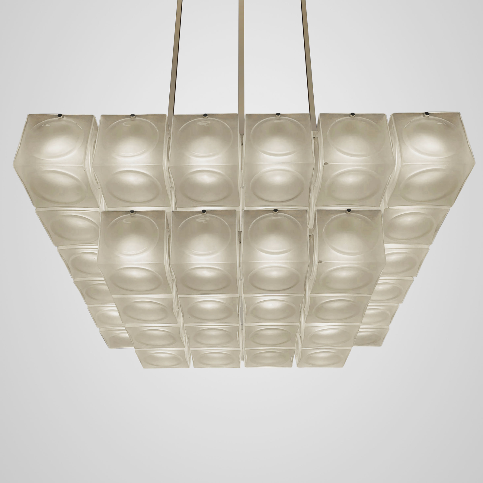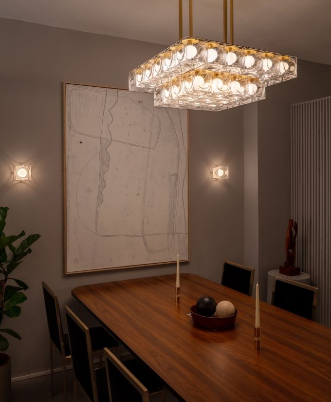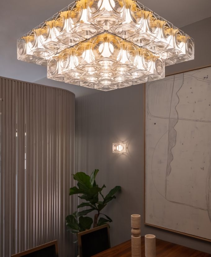 Inspirada en los bloques de vidrio prensado que se utilizaban con frecuencia como alternativa a las vidrieras en lugares de culto durante la década de 1970, Chant está formada por cubos de vidrio soplado con un pronunciado detalle circular, disponibles en vidrio transparente o esmerilado. Construidos en configuraciones cuadradas, los cubos de vidrio se conectan entre sí para formar candelabros luminosos de aspecto arquitectónico, similares a ladrillos, en una o dos alturas.
