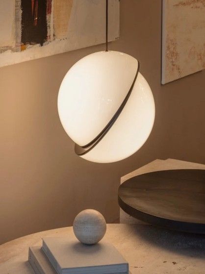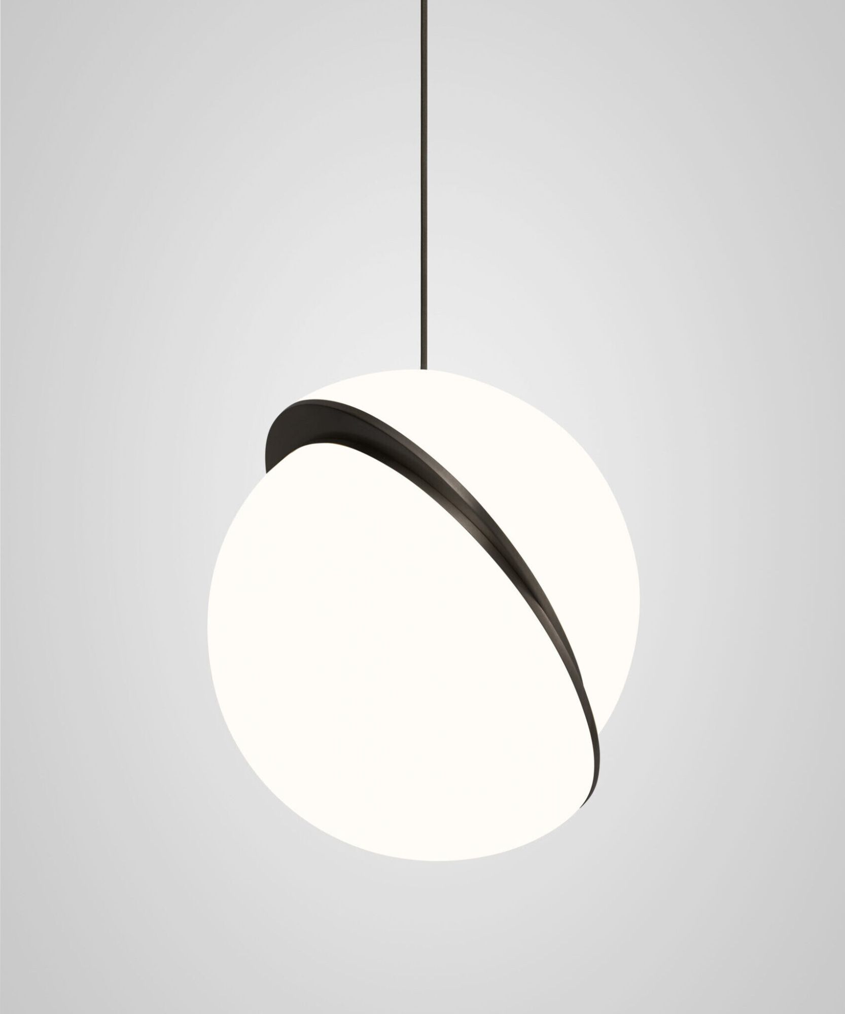 Una esfera iluminada cortada por la mitad revela una fascia de latón cepillado o ennegrecido con forma de media luna; Crescent Light combina a la perfección lo sólido y lo opaco.