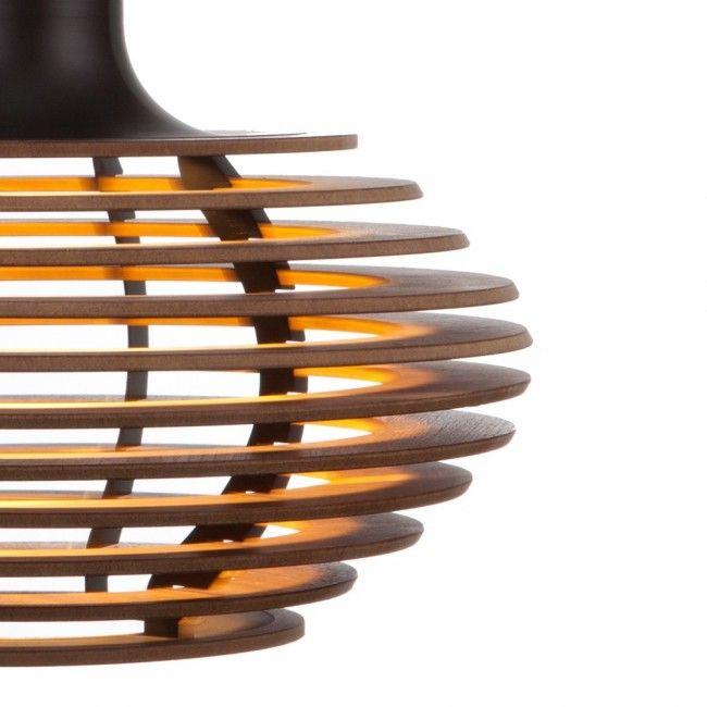 Producido a partir de media hoja de madera contrachapada, la Dipper se diseña de manera estratificada, capa sobre capa, proyectando por esta forma tan particular una luz horizontal suave y difusa, así como descendente. Un foco de bajo consumo es el elegido para ser la fuente iluminativa –blanca– y crear una atmósfera sutil que se suaviza y adquiere un color más natural debido a su reflejo en la madera, casi como un resplandor incandescente que remite a viejos tiempos. En ciertos ángulos, el efecto de la luz es casi un patrón de muaré. Decode en conjunto con Viewport Studio trabajan para lanzar próximamente la versión para mesa y piso de esta lámpara. Por ahora, la tipo colgante la encuentras en dos tamaños (chica y grande) y en tonos roble o nogal con conector en blanco o negro, que aunque sean diferencias mínimas, siempre abre el abanico de posibilidades de tener un interior distinto con estos detalles que hacen la diferencia. Incluye foco.
