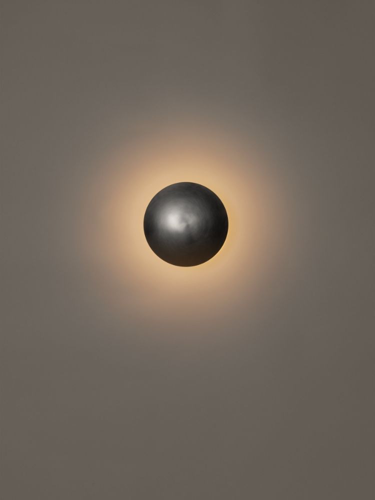 Este disco metálico, disponible en dos tamaños, Disco M y Disco L, refleja su luz en la pared creando un halo alrededor de su opaco círculo. Su fuente LED se encuentra tras la estructura acabada en níquel satinado. Botones de luz en el espacio.