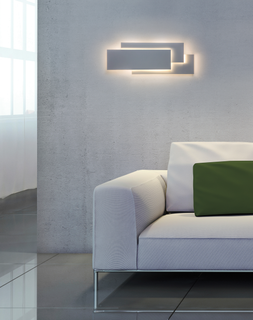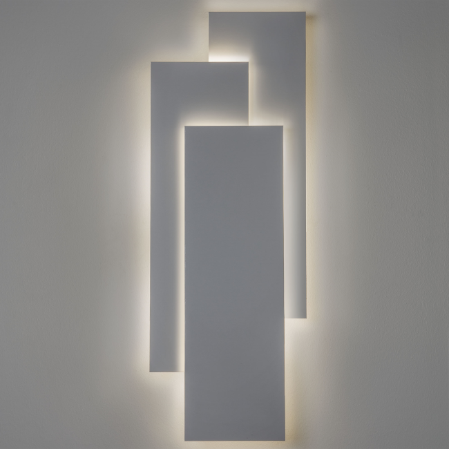 Diseño de James Bassant, para Astro Lighting, la lámpara de pared Edge LED emite la ilusión visual de rectángulos flotantes. Las tres piezas escalonadas combinan una forma escultórica con una iluminación suave para hacer un accesorio decorativo impresionante donde interactúan luces y sombras muy agradablemente. Brinda una luz suave y difusa que es ideal para usar en salas de estar, dormitorios o pasillos en interiorismos modernos.