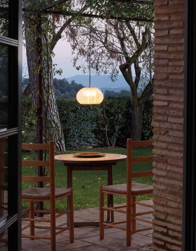 La serie Garota, de Bover, cuenta con versiones de interior y exterior, colgantes, de piso o mesa, formando una amplia colección de lámparas que permiten crear múltiples ambientes o combinaciones a partir de un concepto común: la pantalla en forma de erizo de mar. La S/02 de exterior es una gran luminaria colgante, ideal al aire libre con un marco y dosel de aluminio que puede soportar su exposición a todos los factores ambientales. La pantalla de la lámpara está compuesta de fibra sintética de polietileno tejido a mano y disponible en diferentes colores. La fuente de luz está protegida por una esfera de polietileno escarchado de mediana densidad y con protección UV. El cable eléctrico, igualmente está protegido con un revestimiento de neopreno a prueba de agua. Disponible en acabados marrón o marfil. Garota no es un producto personalizable.