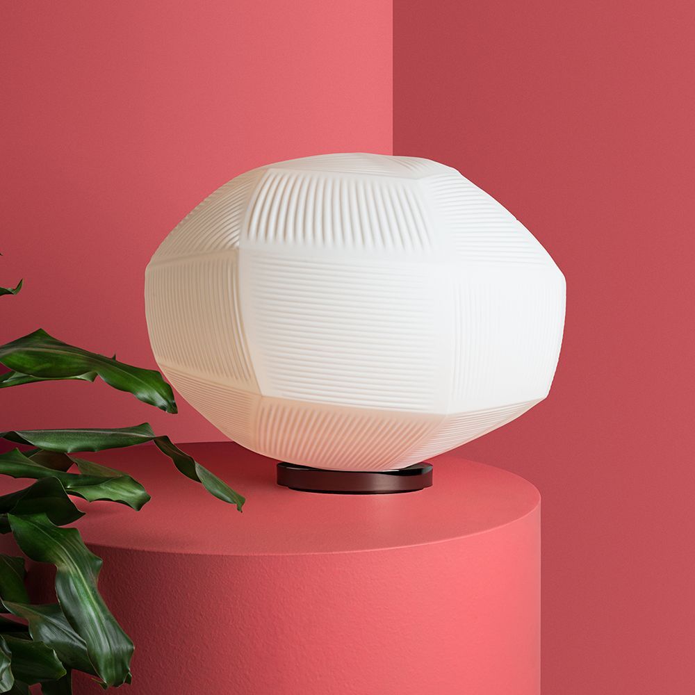 Lámpara de mesa. Estructura en acero galvanizado cromado negro. Difusor de vidrio soplado opal mate. Atenuador colocado en eléctrico cable