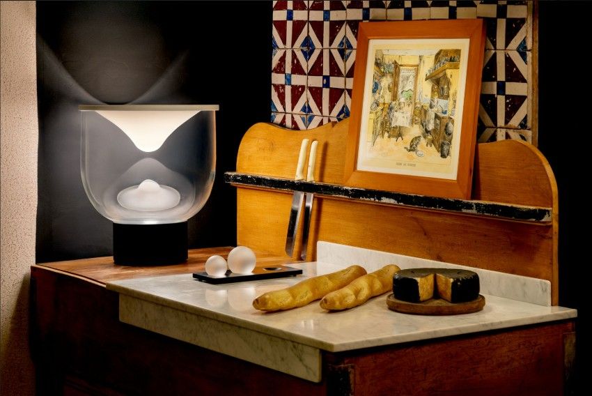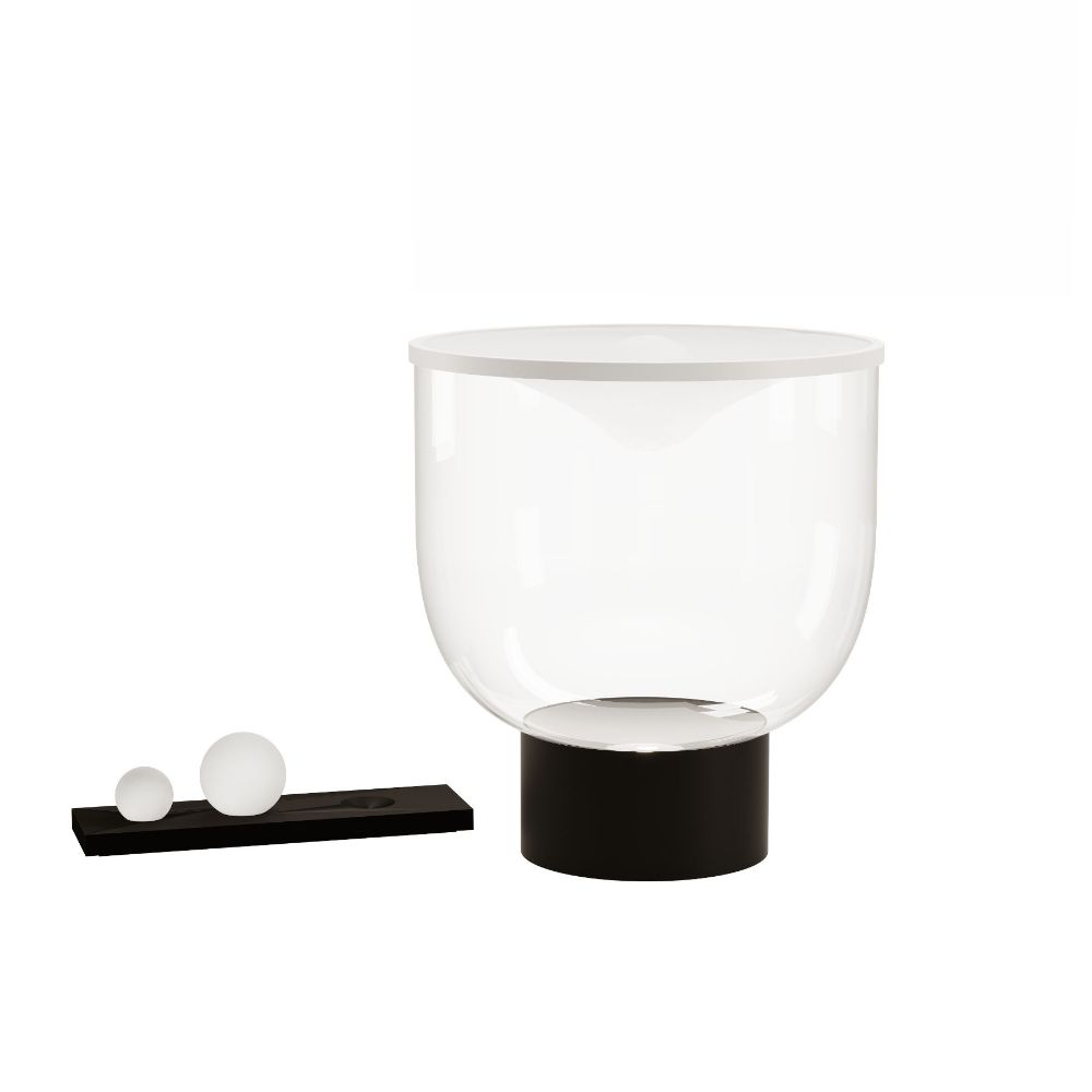 Lámpara de mesa con luz difusa LED dinámica. Regulable. Base de aluminio pintado, estructura de vidrio de borosilicato, membrana superior de Lycra®. La lámpara incluye 3 esferas de vidrio de borosilicato de diferentes pesos: 0.3 kg, 0.7 kg y 1.3 kg.