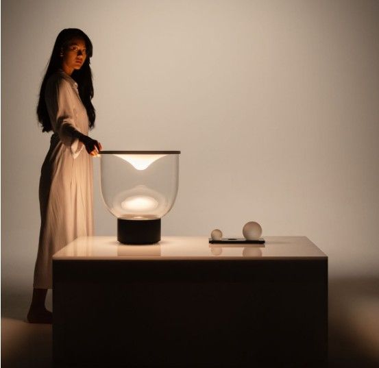 El número y el peso de las esferas colocadas sobre la tela modifican la intensidad y el tono de la luz emitida, aprovechando una fuente LED con blanco dinámico: con pesos ligeros la luz es más suave y cálida, al añadir esferas la luz se vuelve más intensa y fría.