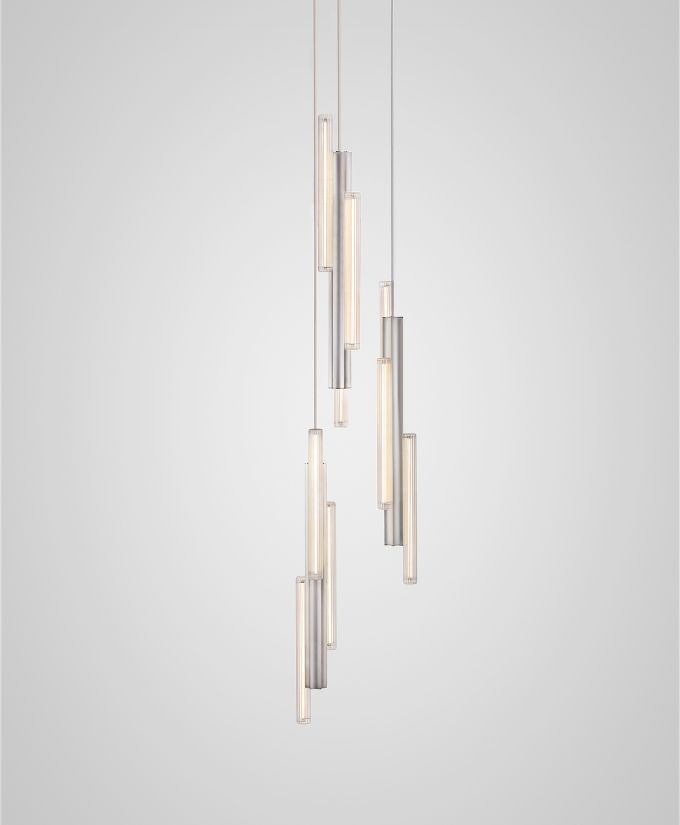 Hail se inspira en los fragmentos de luz y sombra que suelen percibirse a través de las ventanas lancetas de los amplios arcos de las iglesias. Hail presenta una forma alargada y acanalada, fabricada en aluminio, con bombillas de vidrio estriado colocadas de manera asimétrica a lo largo de su estructura.