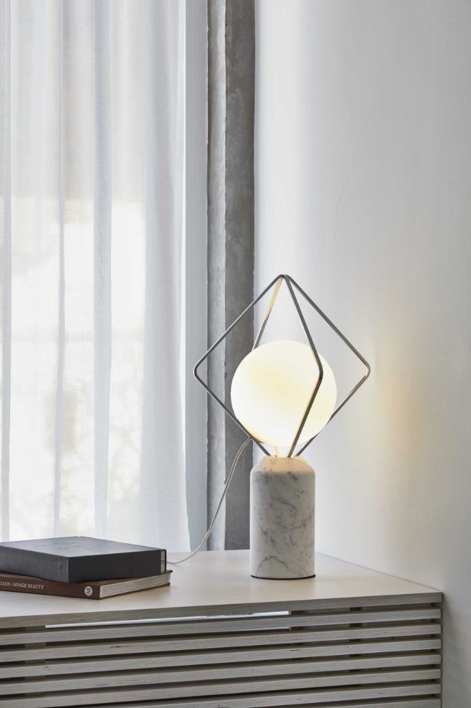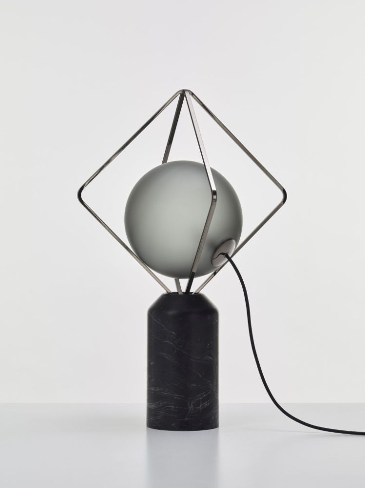 Este moderno elemento de iluminación con base de mármol, marcos metálicos y una "perla" colocada en su interior, diseñado por Lucie Koldova, completa la variable familia Jack O'Lantern. La nueva versión de mesa combina la belleza del vidrio grabado al ácido soplado a mano con base de mármol, en marcos con revestimiento de metal líquido.