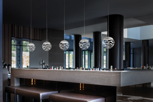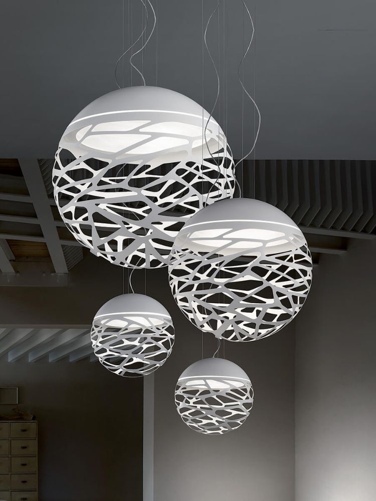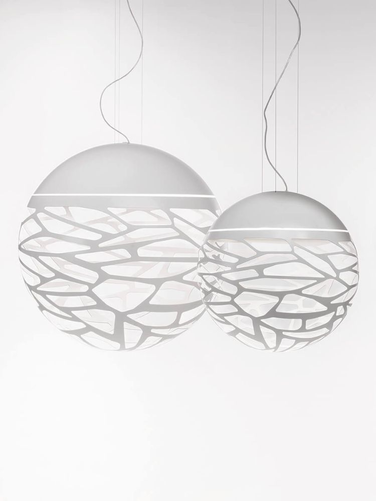 Kelly Cluster reformula brillantemente la intuición creativa de la familia de lámparas Kelly en una esfera escultórica y extremadamente compacta que, montada en un dosel, le permite crear múltiples composiciones como desee. Lámpara colgante metálica, ligera y viva gracias a los particulares cortes láser que crean fascinantes juegos de luces y sombras.