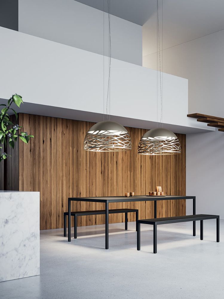 Belleza seductora con una personalidad atrevida gracias a la fuerza y cortes láser precisos, que aligeran el metal de la pantalla y crea un intrigante juego de luces y sombras. Kelly es una familia polifacética de lámparas de suspensión y apliques que destacan con elegancia en cualquier espacio habitable gracias a la variedad de disponibles formas y acabados.