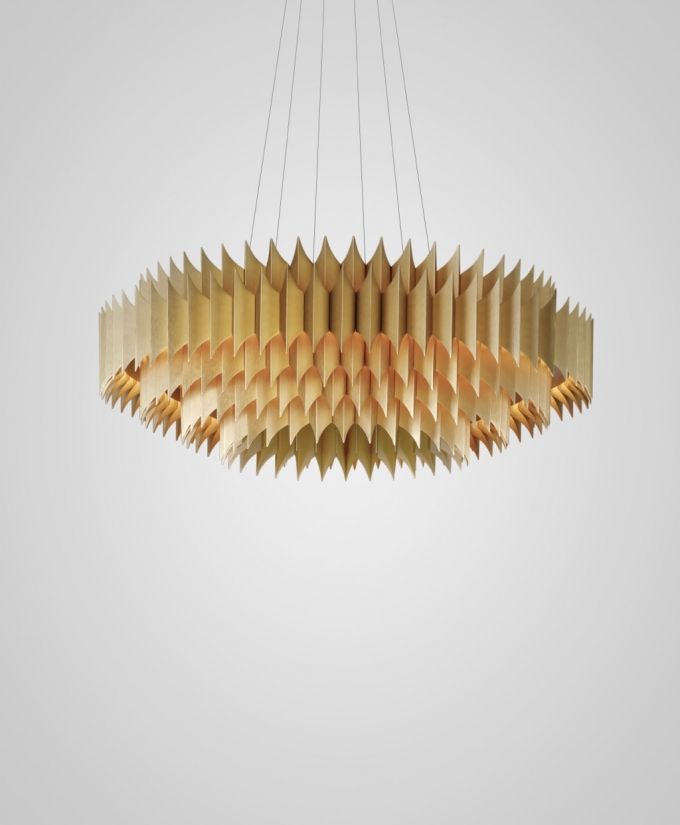 King es una lámpara de araña majestuosa, de proporciones imponentes, que traspasa los límites entre el arte y el diseño. Está compuesta por hojas individuales de metal cepillado, plegadas, afinadas y cepilladas a mano para crear múltiples anillos escalonados, cada uno de los cuales oculta un resplandor luminoso integrado que envuelve las hojas doradas y proyecta juegos de luz y sombra. Concebida como una escultura por derecho propio, King fue imaginada originalmente en torno al personaje del Rey de Salem del libro El Alquimista y la leyenda del Rey Arturo, de ahí su apariencia similar a una corona. Sus características medievales se han fusionado con una estética cercana al brutalismo, lo que convierte a King en una pieza impactante cuando está atenuada y deslumbrante cuando se ilumina.