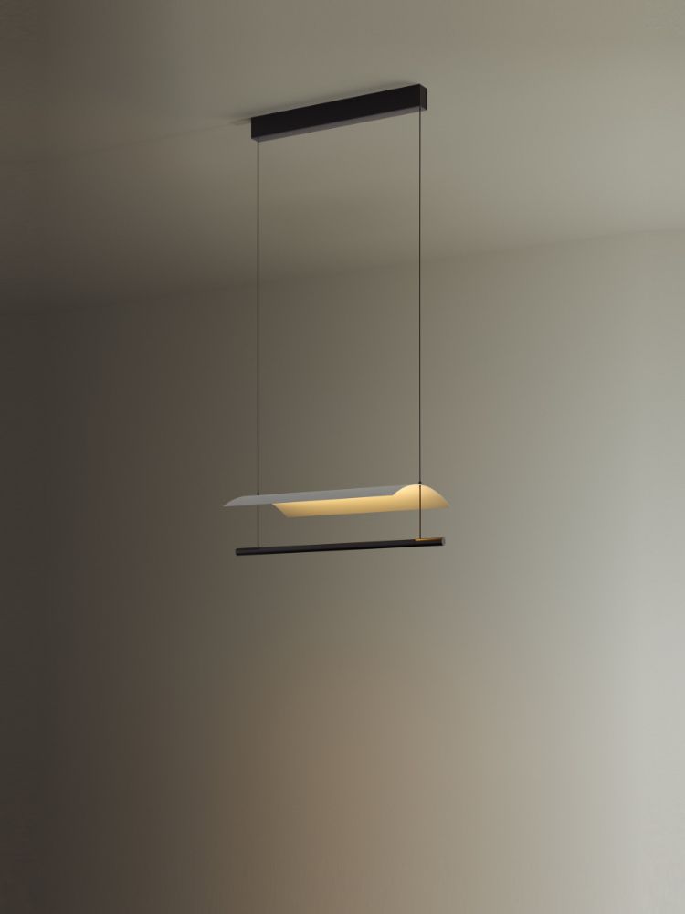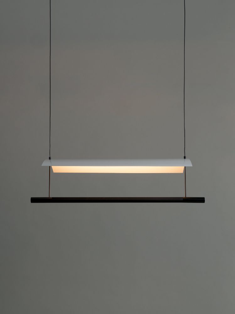 Una línea de luz y una fina lámina en tenue pero eficaz levedad. La familia Lámina nació en volandas como lámparas de suspensión, con una ligereza que sabe ser inteligente. Ahora se pone de pie como esculturas lumínicas que contrastan ante cualquier acabado de la pared a su espalda.