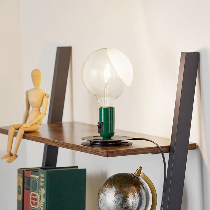 Lámpara de mesa de luz directa/difusa. Base en aluminio anodizado, con función de enrollador del cable eléctrico. Portalámparas en baquelita con acabado pintado en color naranja o violeta. Lámpara globolux transparente parcialmente arenada.