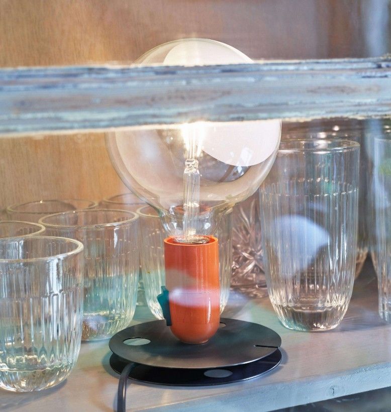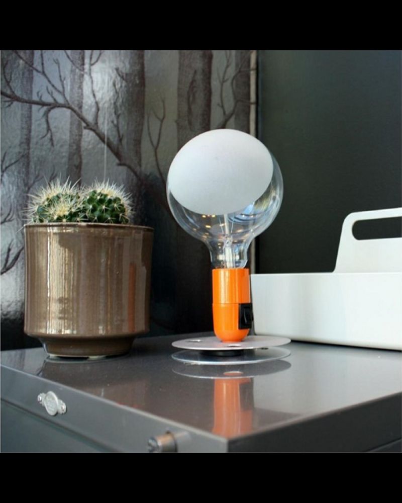 Lámpara de mesa de luz directa/difusa. Base en aluminio anodizado, con función de enrollador del cable eléctrico. Portalámparas en baquelita con acabado pintado en color naranja o violeta. Lámpara globolux transparente parcialmente arenada.