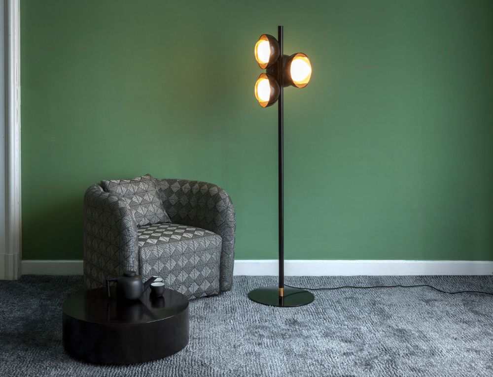 Colección de lámparas metálicas neo-vintage con difusor de doble cara en vidrio de borosilicato. Las cúpulas metálicas (una interna y la otra externa) tienen el lado interno con diferentes colores o acabados: se pueden pintar o terminar en latón pulido y cobre brillante, creando así diferentes combinaciones de texturas. La colección presenta lámparas colgantes, lámpara de pie, lámpara de mesa, pared y techo.