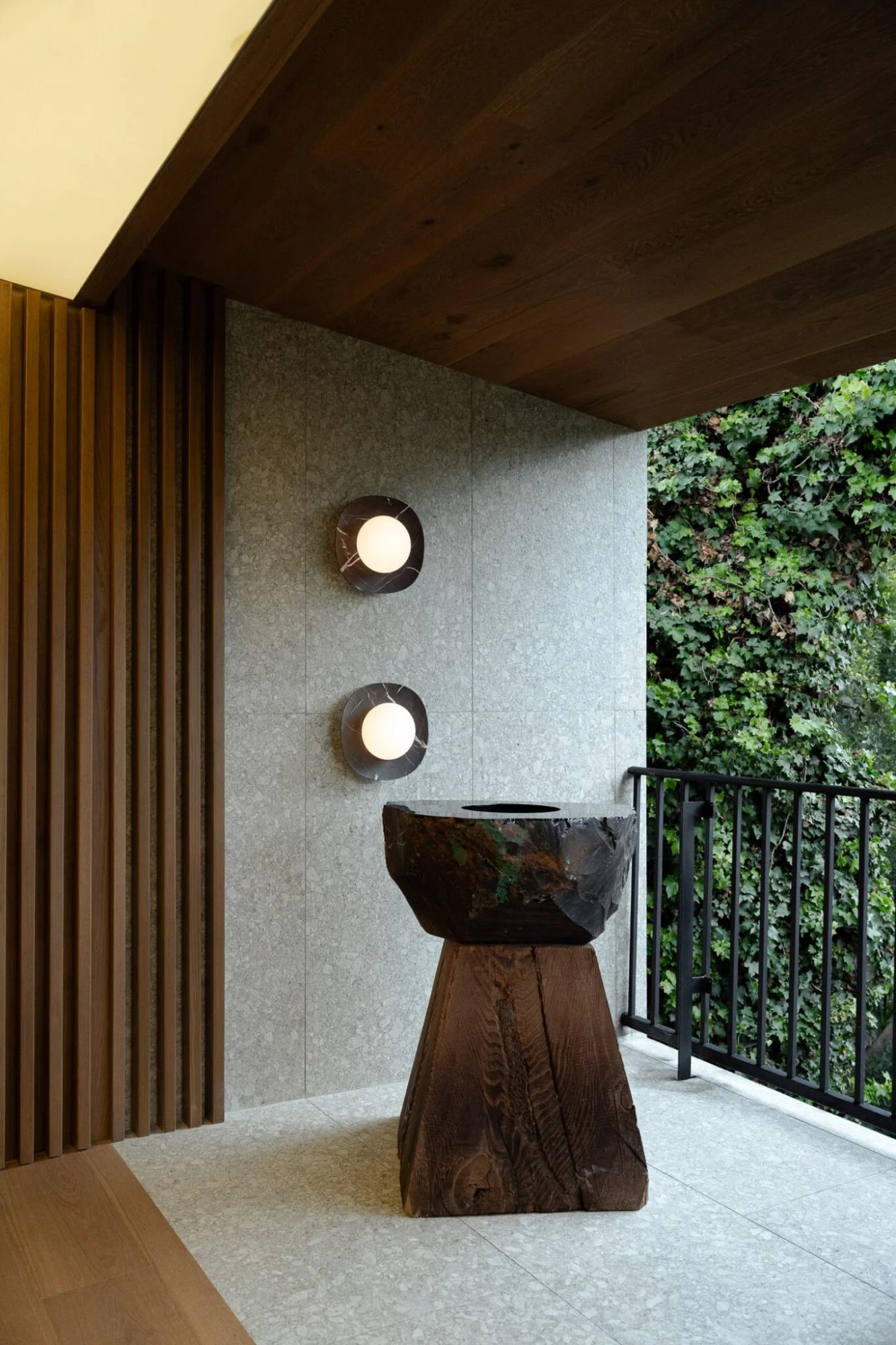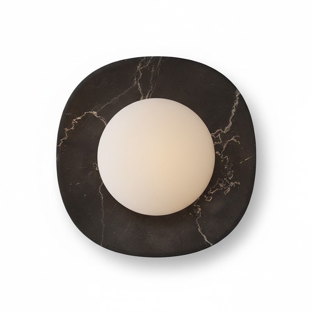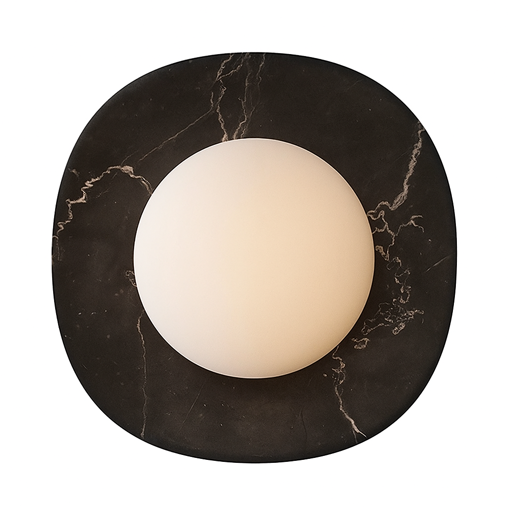 La lámpara de pared NAGA emite su luz a través de un difusor de vidrio opalino sostenido por un cuerpo de mármol negro. Es el resultado de un equilibrio entre la exploración de matices, luces y sombras mediante el uso de materiales como el vidrio y la piedra.