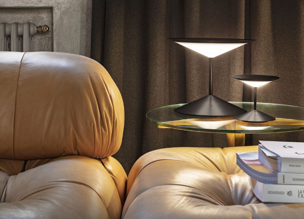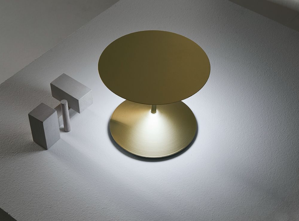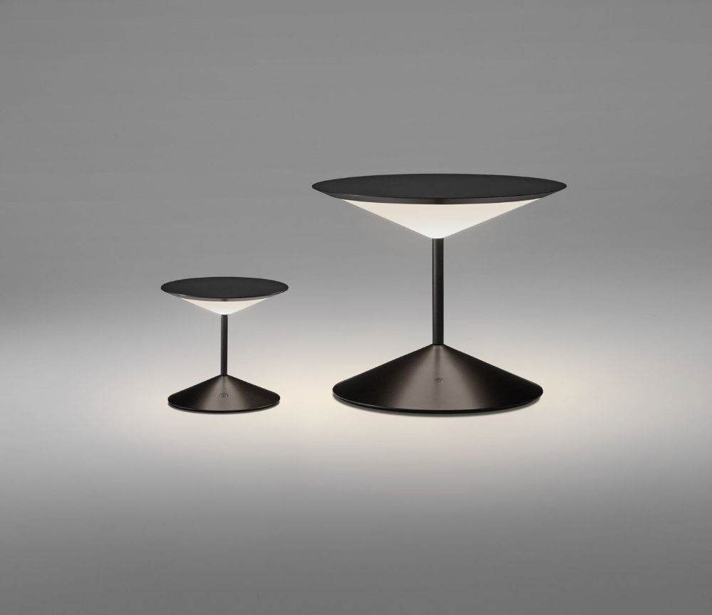 Como en el mito clásico Narciso mira su imagen reflejada en el agua, así mismo el cono de esta lámpara se divide para extenderse y reflejar la delicada luz del cuerpo de iluminación. La versión de mesa es un homenaje a la música, completa con altavoces de audio bluetooth.