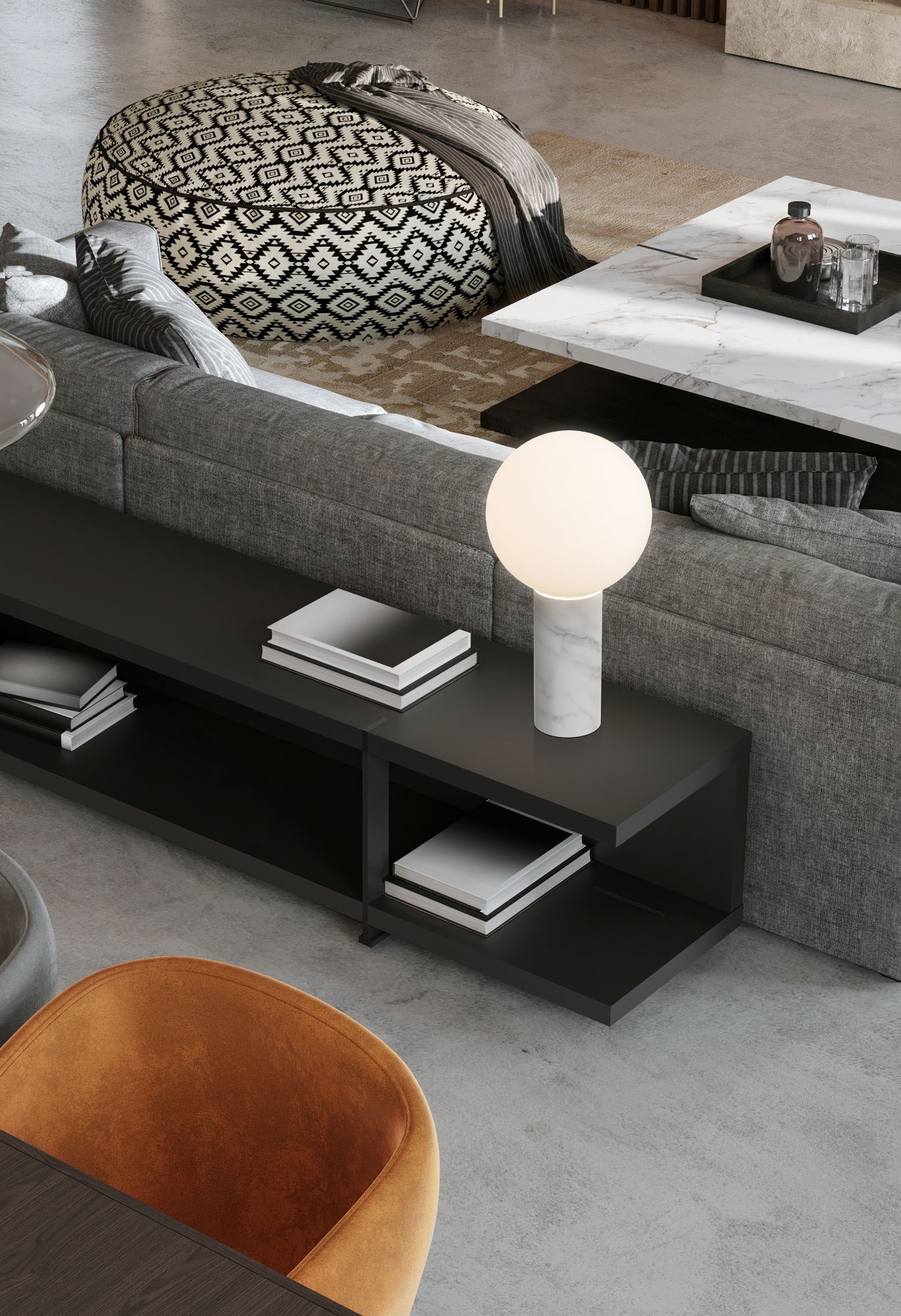 De diseño lúdico y escultórico, Pilar es un estudio en proporciones geométricas que resaltan meticulosamente el carácter de sus materiales para crear pura calidez, iluminación ambiental para cualquier tipo de espacio. Pilar encarna un diálogo armonioso entre la solidez y ligereza con una columna monolítica en mármol con un globo de cristal flotante que definen su silueta icónica. Pilar se ofrece tanto en Carrara bases de mármol blanco y negro marquina con un globo de vidrio esmerilado Opal de 12” (30,5 cm) y cuenta con un atenuador de rango completo en línea para seleccionar cualquier ajuste de luz y ambiente deseados.