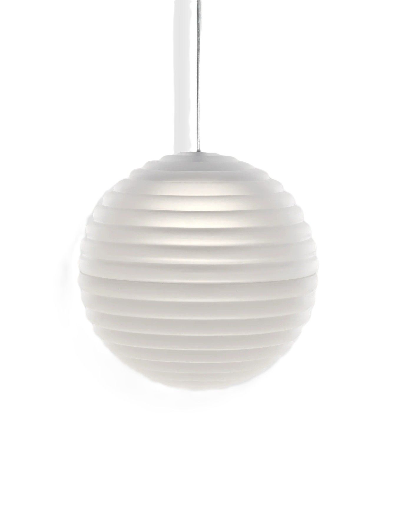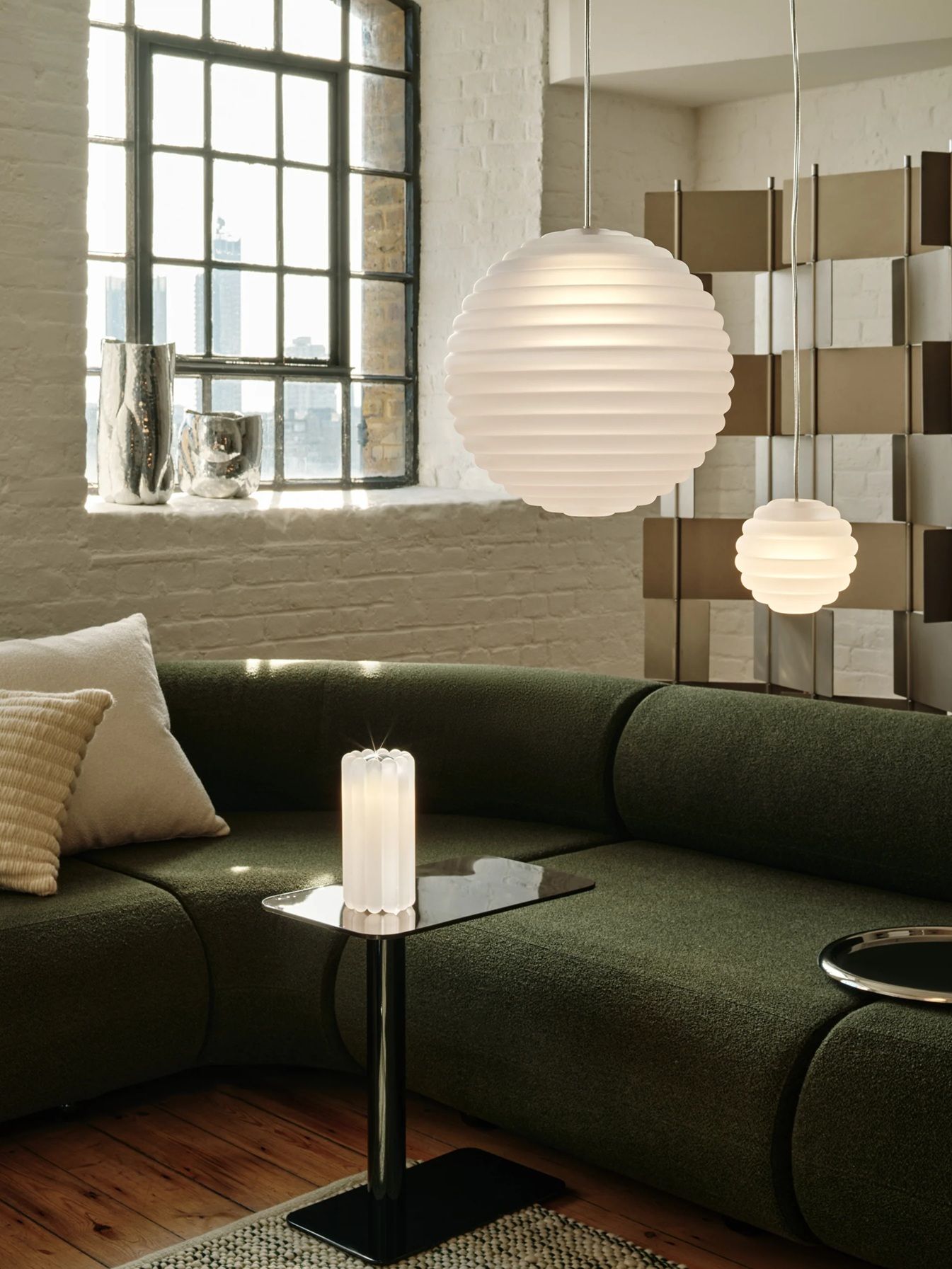 La lámpara colgante esférica esmerilada PRESS, diseñada por Tom Dixon en Londres, está inspirada en boyas marítimas y presenta una superficie lineal redondeada que resulta visualmente atractiva y satisfactoria. La PRESS está fabricada con vidrio grueso, con un acabado esmerilado mediante arenado, que transforma el vidrio transparente en una textura mate translúcida. Este efecto permite emitir una luz suave, cálida y envolvente.