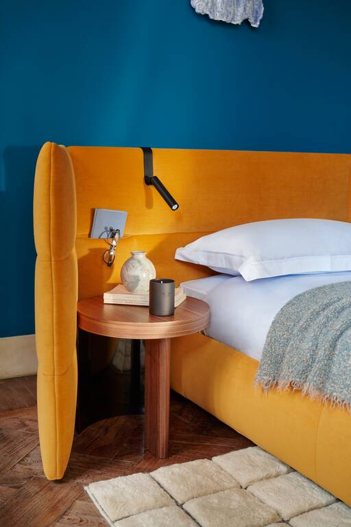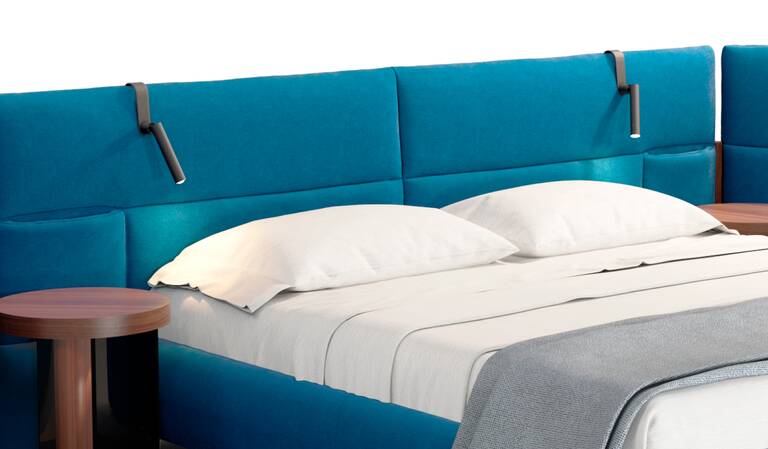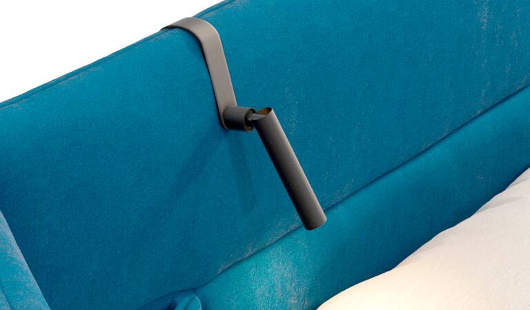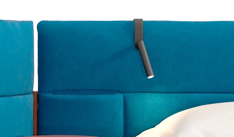 Una lámpara de lectura de diseño específica para la cama Bio-mbo diseñada por Patricia Urquiola. Su forma característica permite colocarla, sin ningún tipo de sujeción, en el cabezal tapizado de la cama, convirtiéndola en un complemento elegante y discreto, perfectamente funcional.