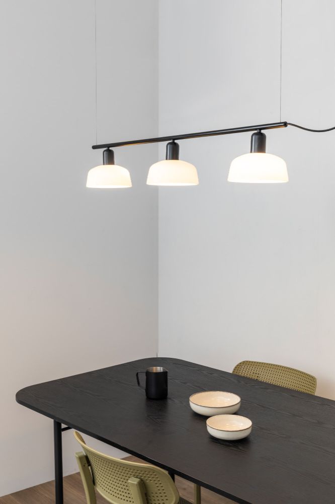 TATAWIN LINEAL S es una familia de luminarias diseñadas por Adolfo Abejón. La forma de la pantalla recuerda a la parte superior de las características viviendas de Tataouine, ciudad situada al sureste de Túnez. Esta lámpara colgante lineal de color negro tiene las pantallas de cristal blanco opal.