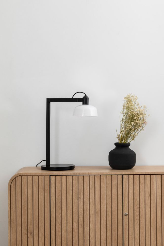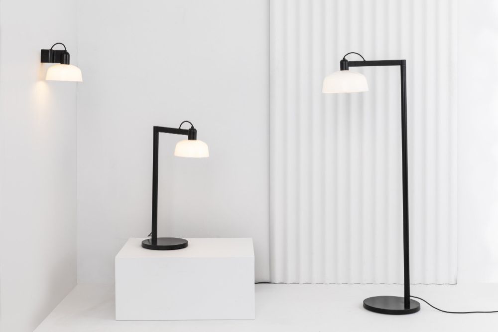 TATAWIN is a family of lamps designed by Adolfo Abejón. The shape of the lampshade is reminiscent of the upper part of the characteristic houses of Tataouine, a city located in southeastern Tunisia. This table lamp with a swivel arm has a black metal structure and a white opal glass shade.