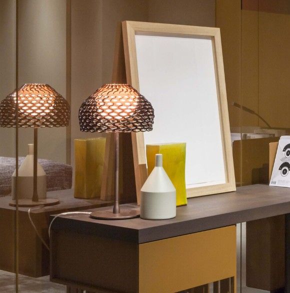 Lámpara de mesa de luz difusa. Difusor exterior en Policarbonato. Difusor interno de policarbonato opalino impreso por inyección. Soporte y base en acero pintado.