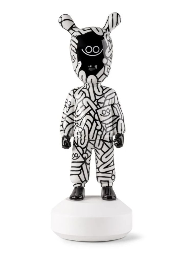This limited edition of 300 pieces bears the creative signature of Juan Díaz-Faes, an artist, muralist, and illustrator known for his friendly and engaging visual language. Crafted in porcelain and hand-decorated, it features a complex interweaving of black and white lines across the entire surface, transforming the silhouette of The Guest into a three-dimensional support for the artist's most recognizable imagery. Through geometric shapes, enveloping lines, and looping faces, Díaz-Faes creates a hypnotic and dynamic effect that seems to take on movement within the piece. The result is a graphic landscape that invites you to observe it from all angles, uniting artisanal technique and visual power in a resolutely personal proposal.