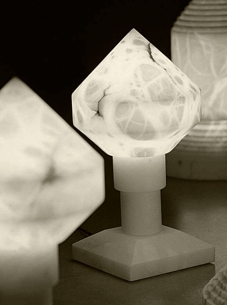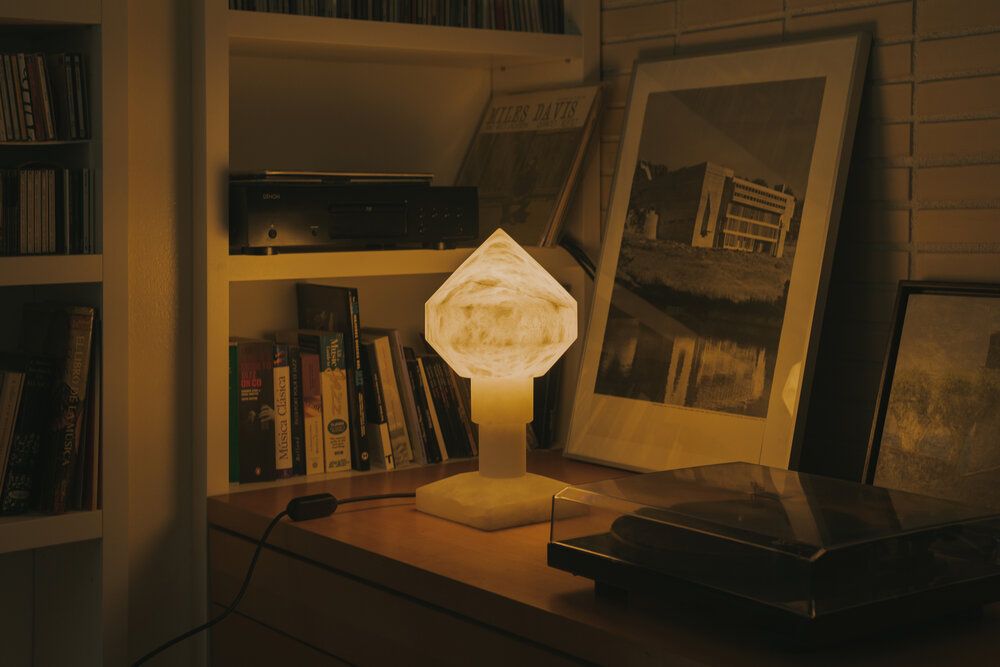 Inspirada en una pieza del art déco, Zeleste se presenta como una lámpara que acompaña en liturgias nocturnas. Su historia nos remite a la década de 1970 con su peculiaridad marcada por el material que la conforma: el alabastro, una piedra translucida que aporta una calidez muy especial.