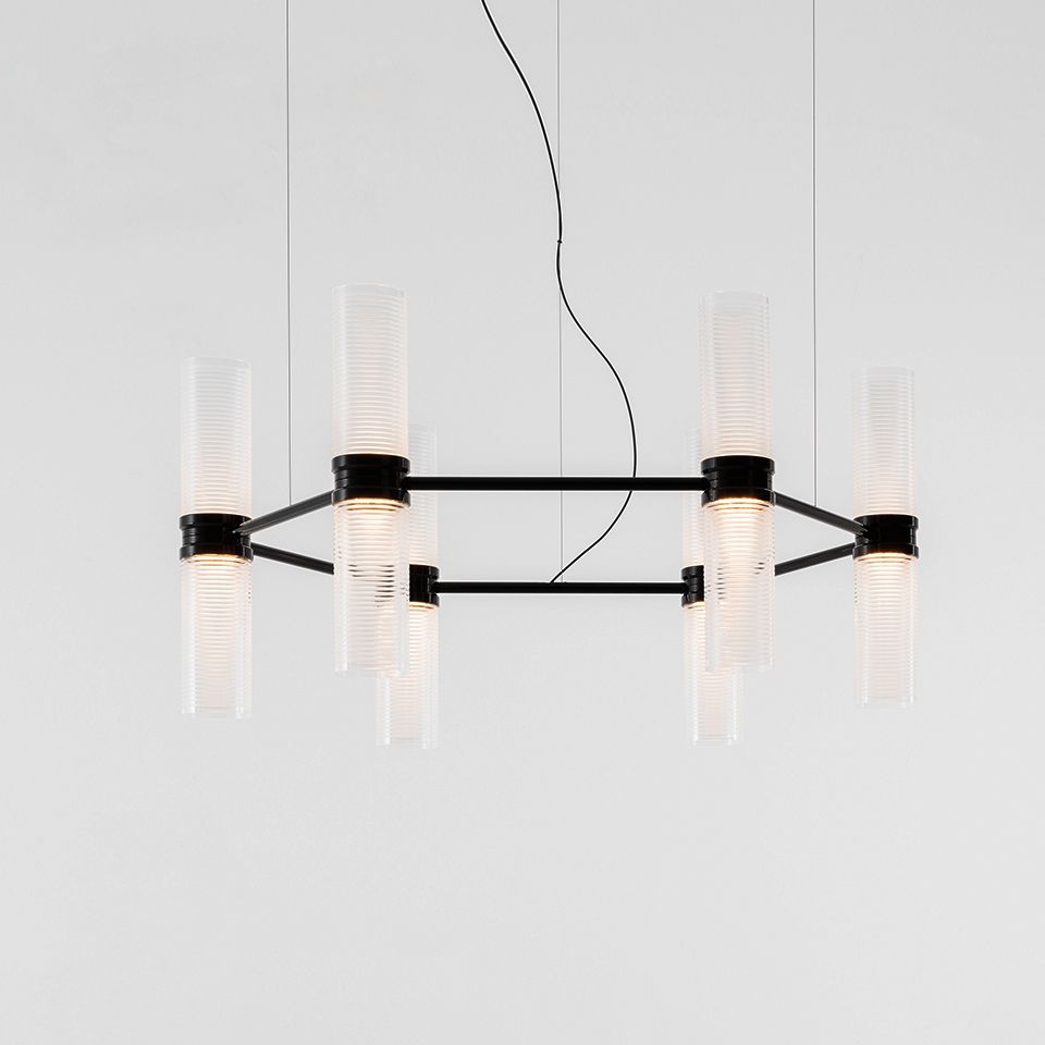 Zephyr is a minimalist, elegant chandelier with a modular frame that enables infinite custom layouts to be designed to fit the needs of each project.  The modular element is a double cylindrical diffuser with a central body that encloses the light sources and, by means of two rings rotating on the same axis, defines the position of the neighboring lighting bodies by positioning the connecting structural elements.