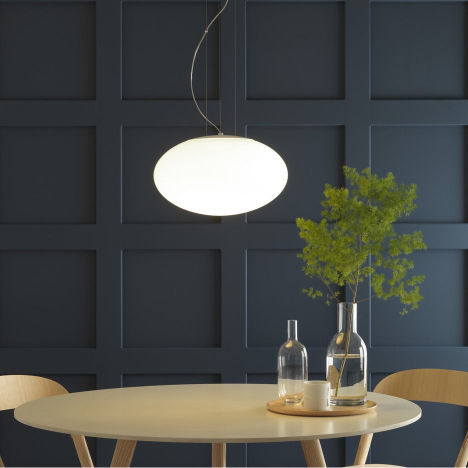 La lámpara colgante Zeppo tiene una delicada forma ovalada horizontal que es elegante y moderna al mismo tiempo. El difusor de vidrio ópalo blanco es funcional y hermoso, con un brillo suave y cálido. Se combina con un acabado de metal cromado y así tener un borde elegante. Proporciona iluminación ambiental difusa, ideal para salas de estar modernas, cocinas y bibliotecas. Disponible en dos tamaños de diámetro.