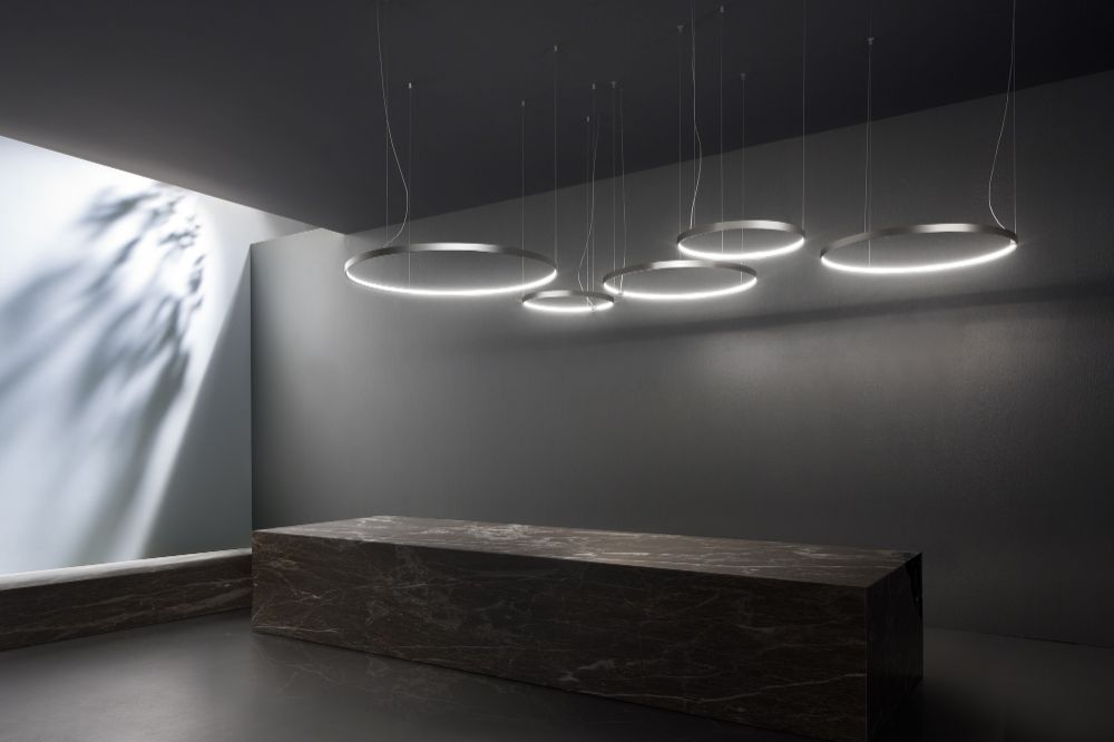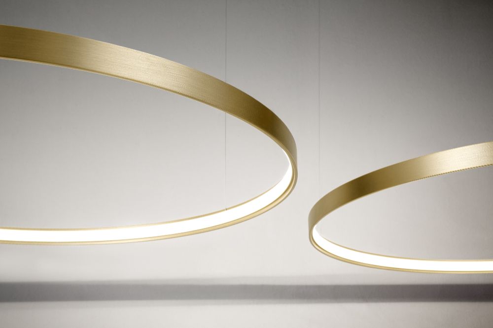 Lámpara de suspensión horizontal, lámpara de pared y techo en aluminio curvo extruido, con pantalla de policarbonato opal. Emisión en el lado interno proporcionada por módulos LED con tecnología DALI/Push DIM integrada. Ideal para oficinas, salones, salas de estar y espacios públicos.