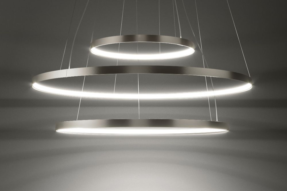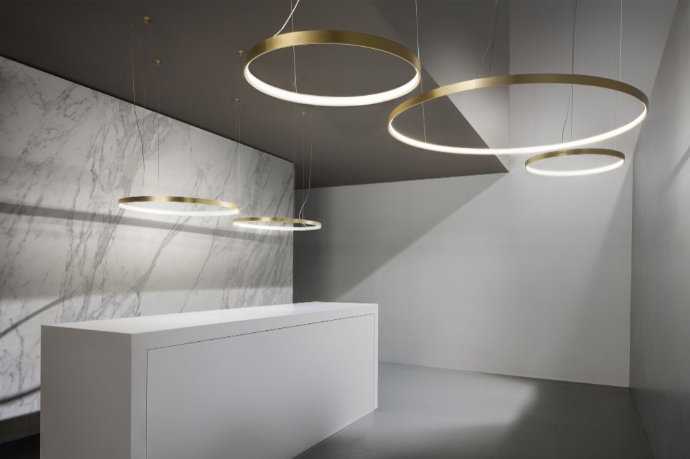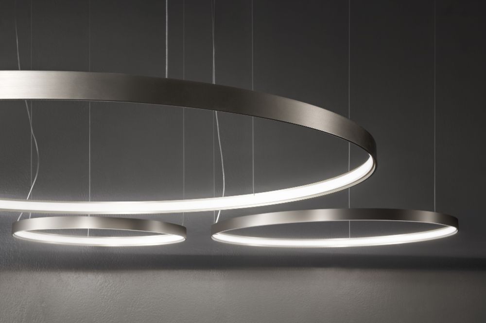 Lámpara de suspensión horizontal, lámpara de pared y techo en aluminio curvo extruido, con pantalla de policarbonato opal. Emisión en el lado interno proporcionada por módulos LED con tecnología DALI/Push DIM integrada. Ideal para oficinas, salones, salas de estar y espacios públicos.